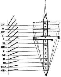 赤外、レッド、オレンジ、イエロー、ポジティブグリーン、ブルー、インディゴ、紫外、ホワイト、ネガティブグリーン(グレイ)、ブラック、これら12 のエネルギーには、それぞれ共振共鳴する角度があり、このペンデュラムは、リングの位置を動かすことでディテクトするエネルギーを選択できます。ロッド先端部とリング下部の位置で仮想の三角錐状の形状が表れます。これが、各エネルギーと共鳴する形状《フィクショナルコーン》です。人、形、音、空間のカラーエネルギー測定などを行えます。昨今ではジオパシックストレス対策のためのエネルギーラインの測定や対策後のエネルギーチェックにも多く活用されています。また、BG3 エネルギーの個別の測定検出も可能です。